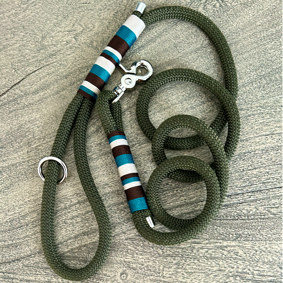 Built from 10 mm premium nylon rope, it offers a firm, responsive feel during walks, training, or everyday handling. Micro-paracord wraps in brown, white, and turquoise add a refined touch and secure all transition points without compromising flexibility.